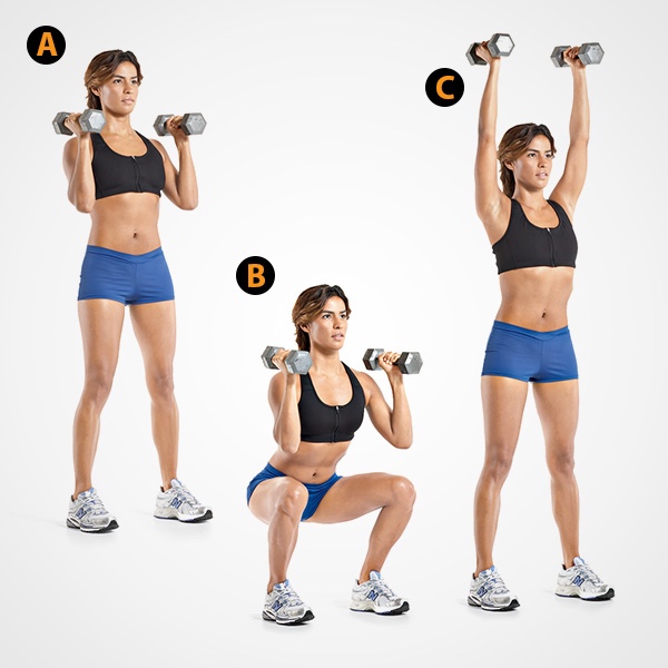 Lastly, wrap up the exercise with an overhead press. Straighten out your legs and bring the dumbbells above your head until your arms are totally straight. If the weight of the dumbbells is too heavy, feel free to utilize the force from your legs to raise the weights.